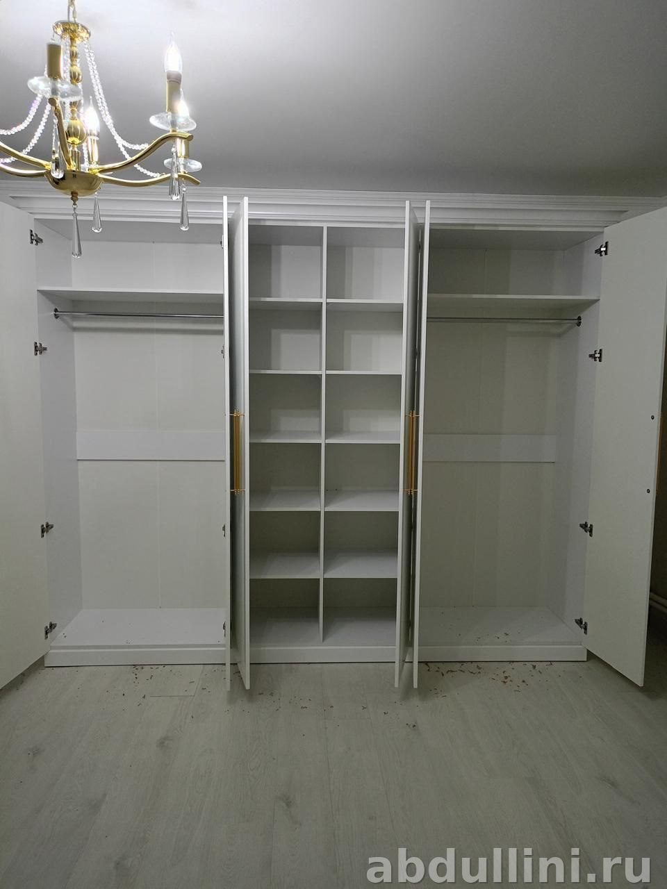 Трехсекционный шкаф-купе с распашными дверцами и стеллажом. Две боковые секции — под вешалки и полки, центральная — открытые полки для хранения. Белый матовый корпус с золотистыми ручками и молдингами в стиле неоклассика.