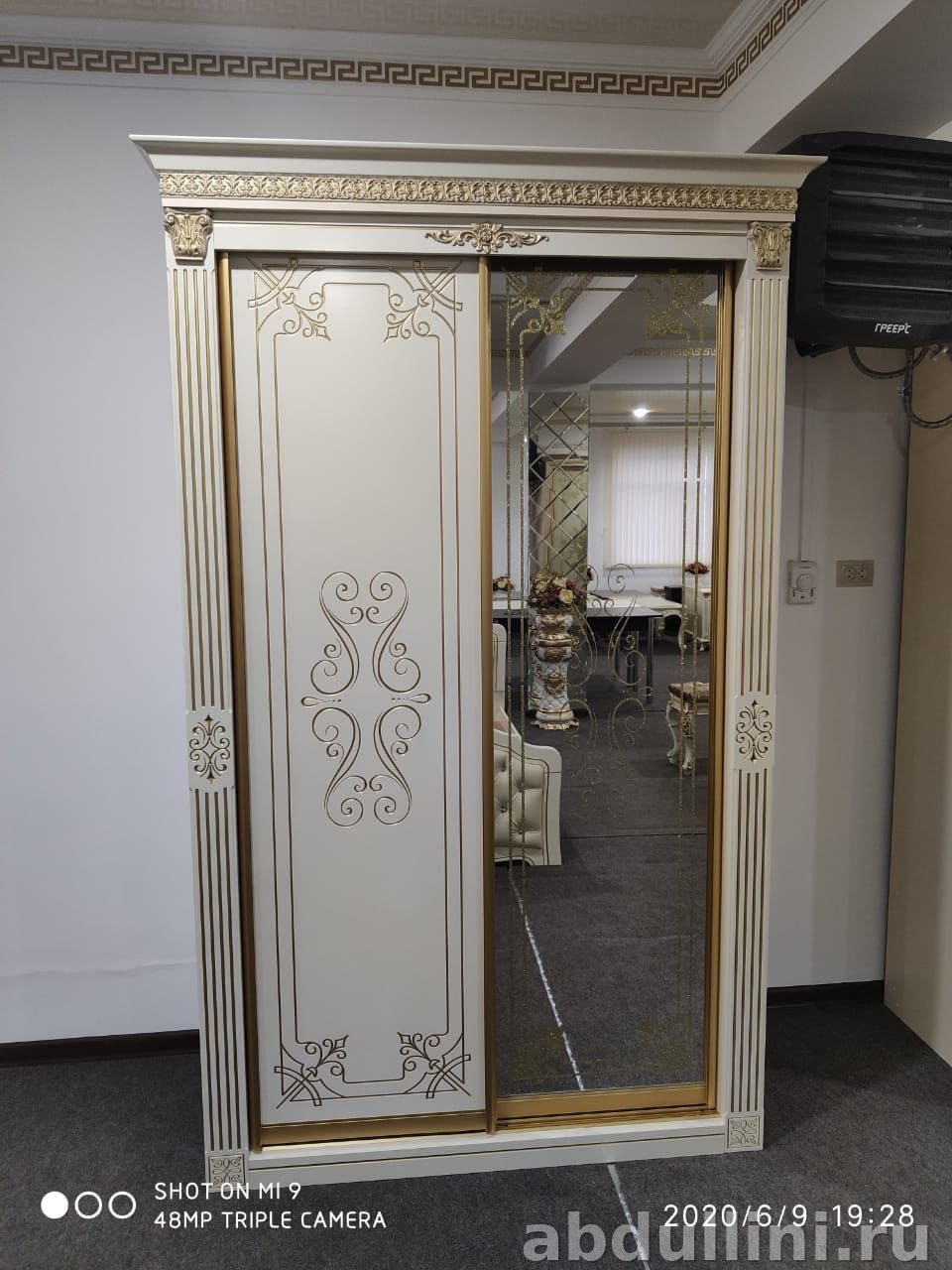 - Материал: Корпус из ЛДСП или МДФ с глянцевым покрытием, двери с зеркальными вставками, декоративные элементы из пластика или МДФ с золотистым покрытием.