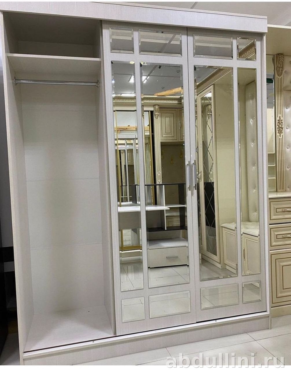 Стиль: модный с элементами неоклассики. Лаконичные формы и зеркальные вставки делают шкаф функциональным и визуально легким.