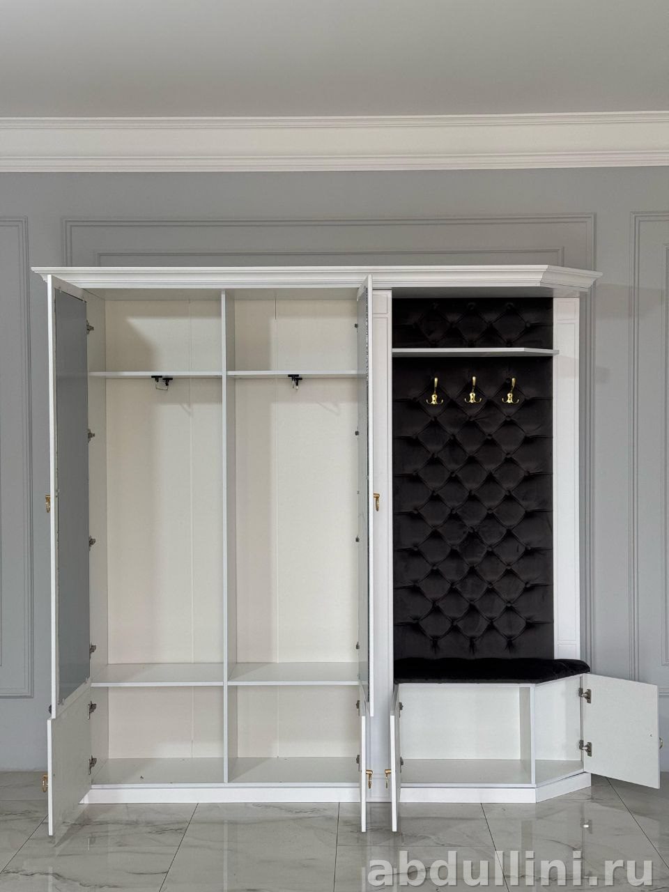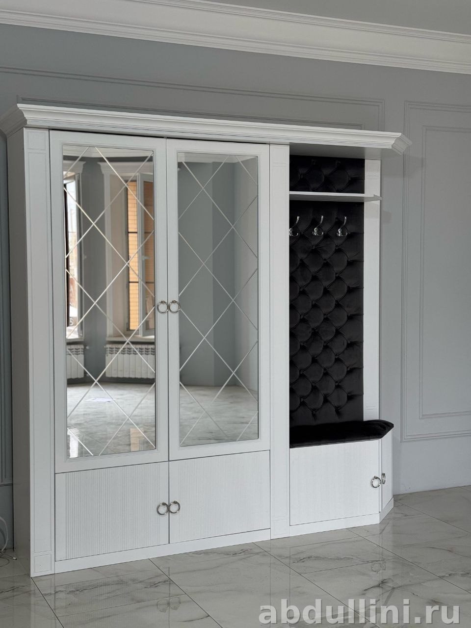 Белый глянцевый гарнитур с зеркальными дверцами и мягкой стеновой панелью. В комплекте: шкаф с полками и выдвижными ящиками, открытая секция с крючками и тумба с откидной дверцей и сиденьем.
