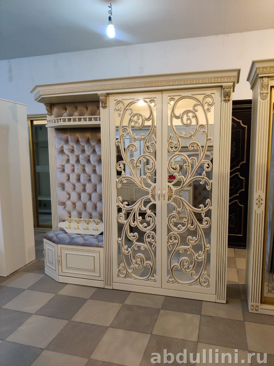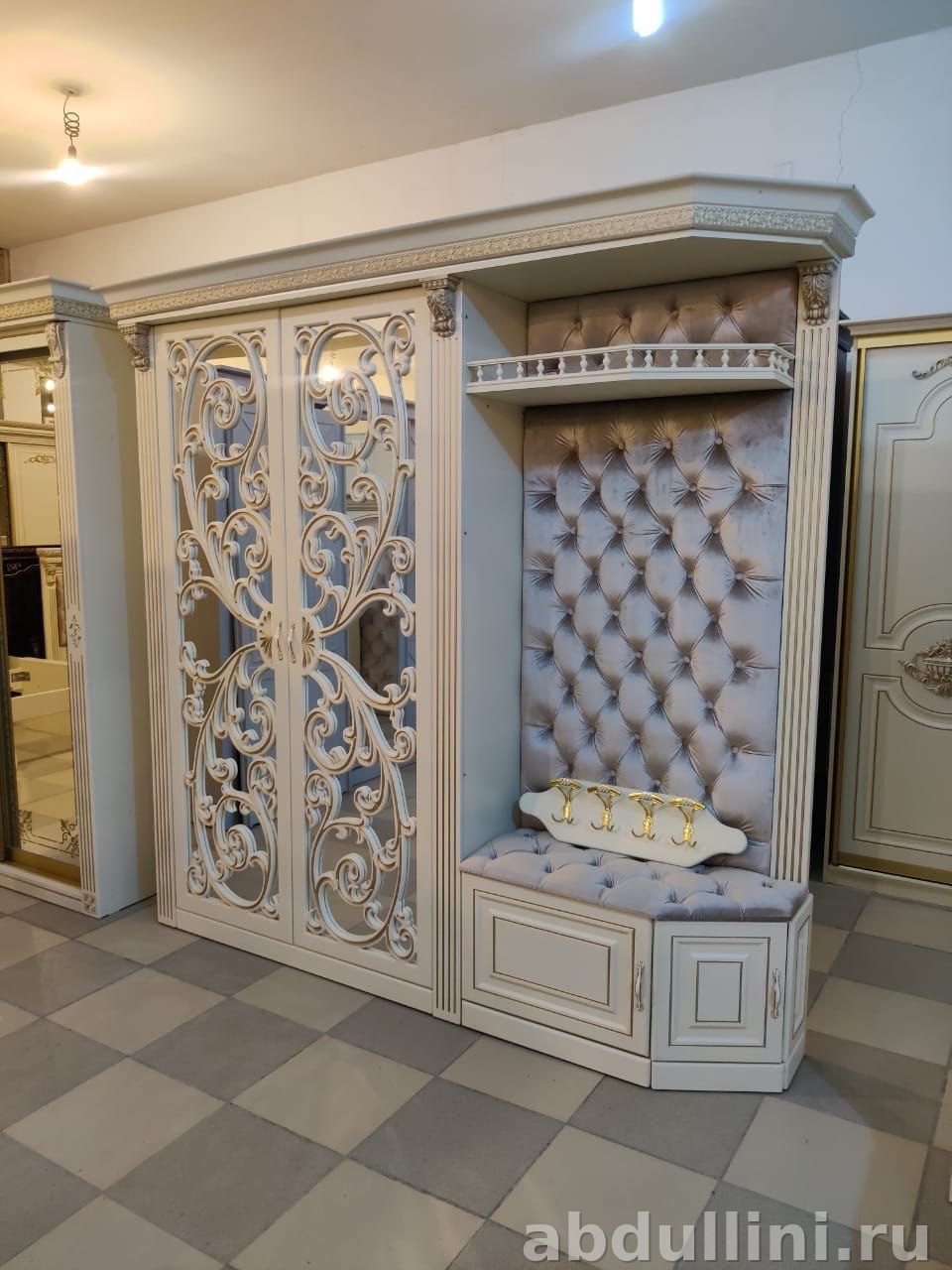 - Шкаф: две распашные дверцы с зеркальными вставками и ажурным узором. Внутри — полки и штанга для одежды.