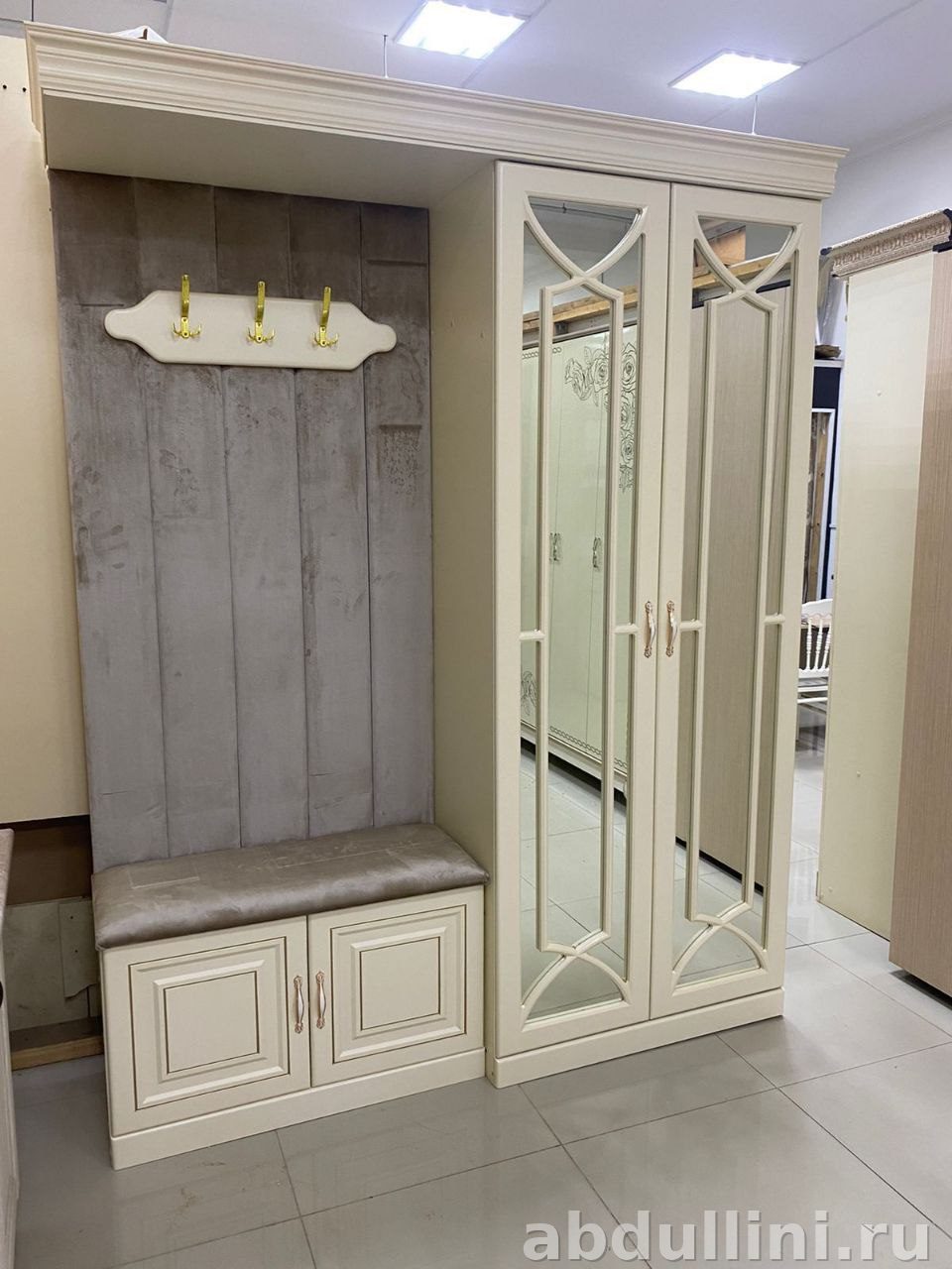 Прихожая Глория — это готовое решение для вашего дома. Комплект включает шкаф с зеркальными вставками, открытую секцию для одежды и тумбу с мягким сиденьем. Мебель выполнена в классическом стиле с элементами декора: фигурные зеркала, фрезеровка на фасадах, декоративный карниз.