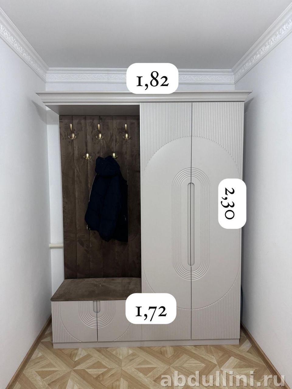 - Открытая секция: Оснащена несколькими крючками для одежды. Под крючками расположена банкетка с мягким сиденьем, что делает её удобной для использования.