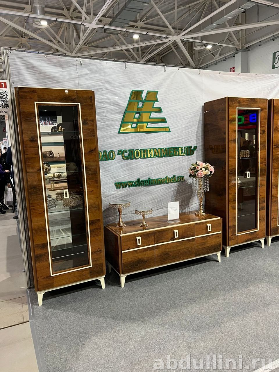 Комплект из двух шкафов-витрин и тумбы под ТВ производства Беларуси. Цвет — насыщенный орех глянец с контрастными белыми вставками. Гарнитур выполнен в неоклассическом стиле с элементами модерна.