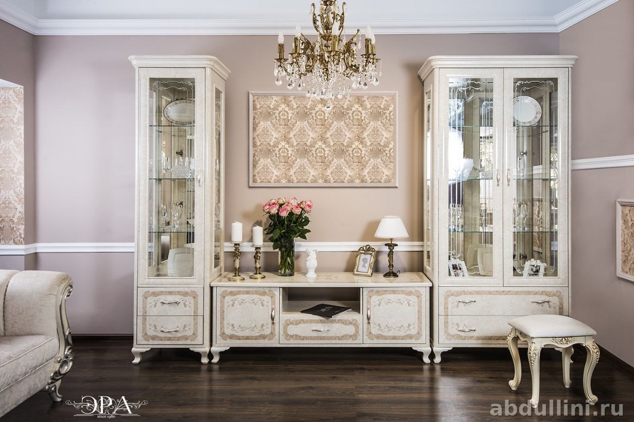 Комплект включает два шкафа-витрины, тумбу под телевизор и мягкий пуф. Производство — «Эра» (Ставрополь). Мебель в классическом стиле с элементами неоклассики: плавные линии, патинированные узоры на фасадах, стеклянные вставки.