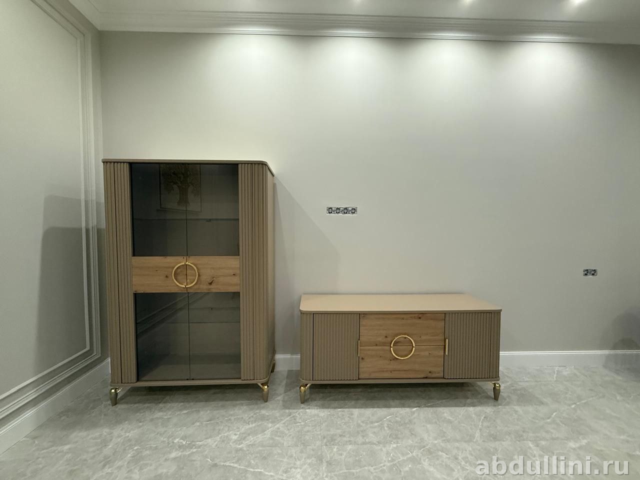 Комплект мебели «Мадрид» состоит из двух предметов: шкафа-витрины и ТВ-тумбы. Основной цвет – приглушенный бежевый, отделка матовая, без глянца. Декоративные элементы включают вертикальные полосы на боковых стенках и круглые золотистые ручки. Ножки мебели также золотистого оттенка, что добавляет изящества.