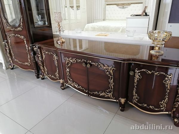 Комплект выполнен в классическом стиле с золотистыми узорами и резными элементами. Подойдет для создания элегантного интерьера. Купить в Дагестане мебель на заказ от производителя – просто и выгодно. Доставка и сборка по региону.