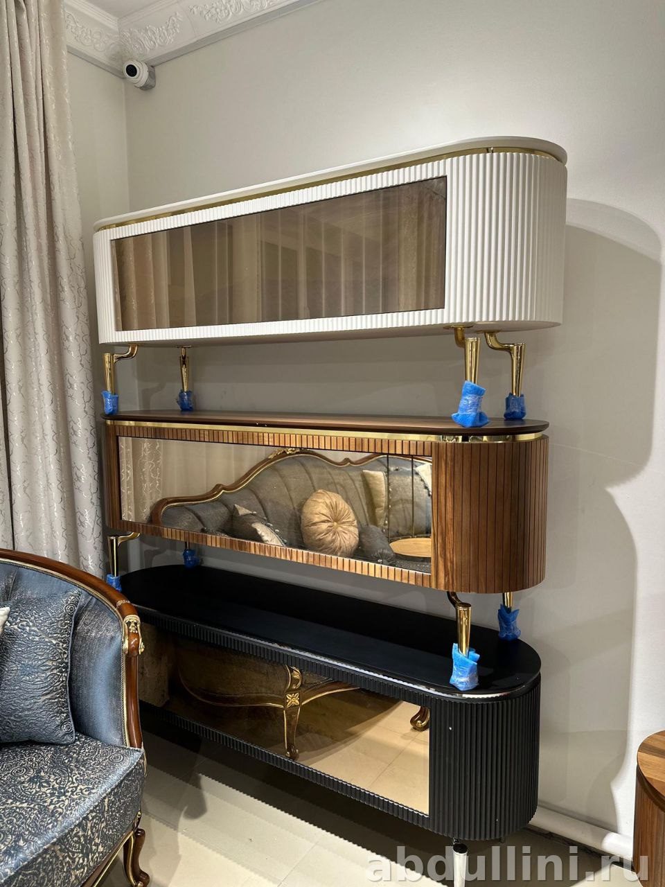 - Материалы: МДФ/ЛДСП с матовой отделкой, зеркальные вставки, металлическая фурнитура с золотистым покрытием
