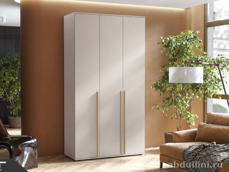 Шкаф состоит из трех вертикальных секций, каждая из которых закрывается отдельной дверцей. На дверцах установлены вертикальные ручки с латунным покрытием, которые добавляют акцент и подчеркивают элегантность модели. Внутреннее наполнение включает полки и штангу для одежды, что обеспечивает удобство хранения вещей.