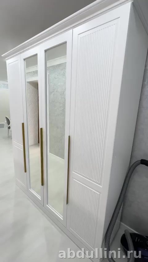 Шкаф имеет четыре распашные дверцы, две из которых оснащены зеркалами. Это не только добавляет функциональности, но и визуально расширяет пространство. Крайние дверцы украшены вертикальными полосами, создающими текстурный эффект. Золотистые ручки контрастируют с белым цветом, добавляя акцент.