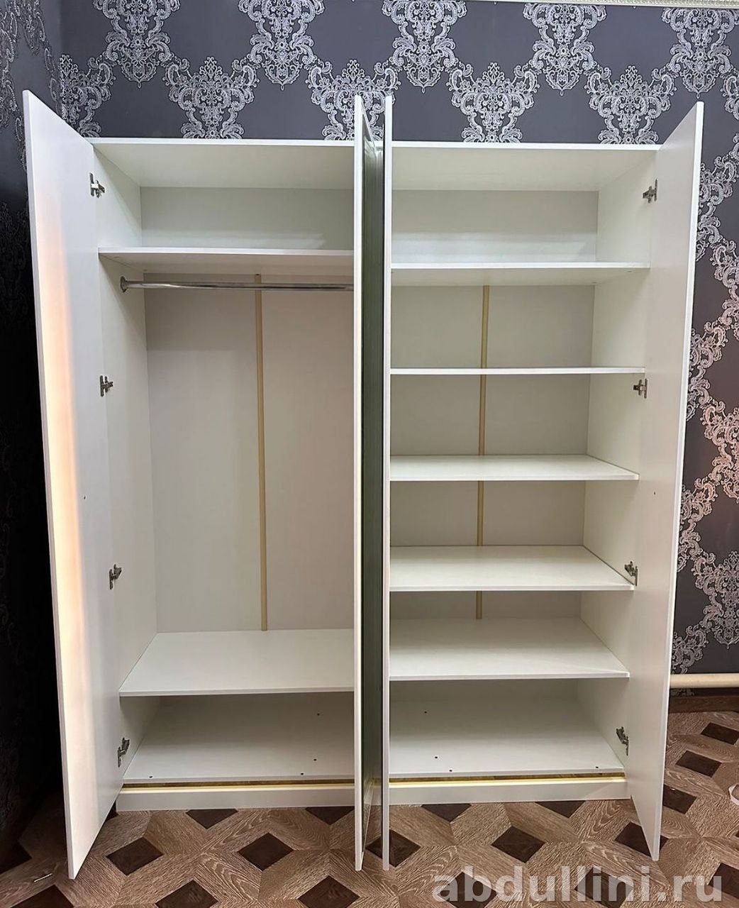 Четырехдверный шкаф с зеркальными вставками и глянцевой поверхностью. Основной цвет — белый, дополненный золотистыми декоративными элементами. Вертикальные рельефные полосы на крайних дверцах добавляют текстуру.