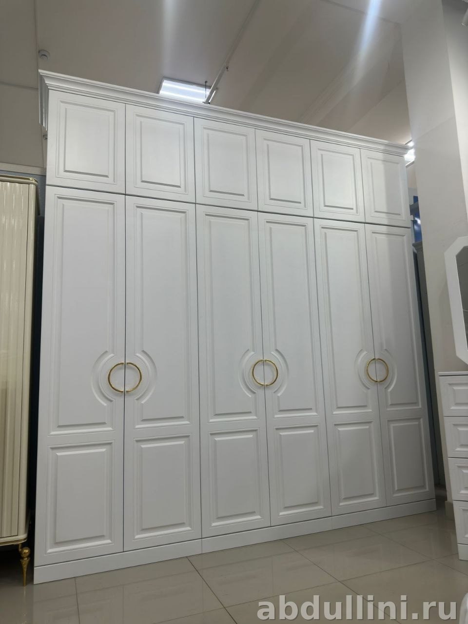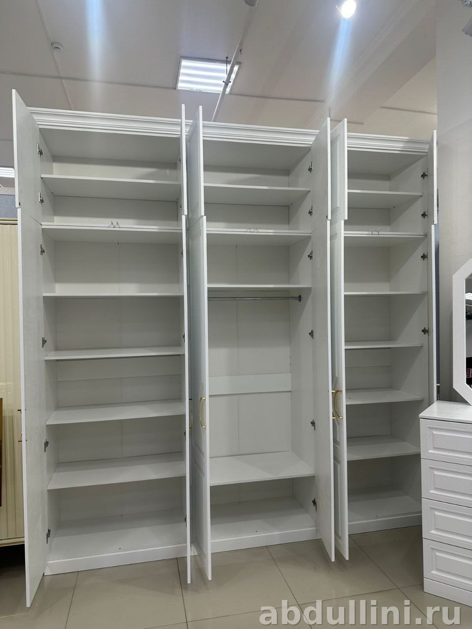 Этот шкаф подойдет для тех, кто ценит порядок и удобство. Вмещает много вещей благодаря шести или четырем дверцам (в зависимости от ширины) и антресолям. Верхние секции — отдельные, с собственными дверцами. В центральной части есть штанга для вешалок, а в остальных — полки.