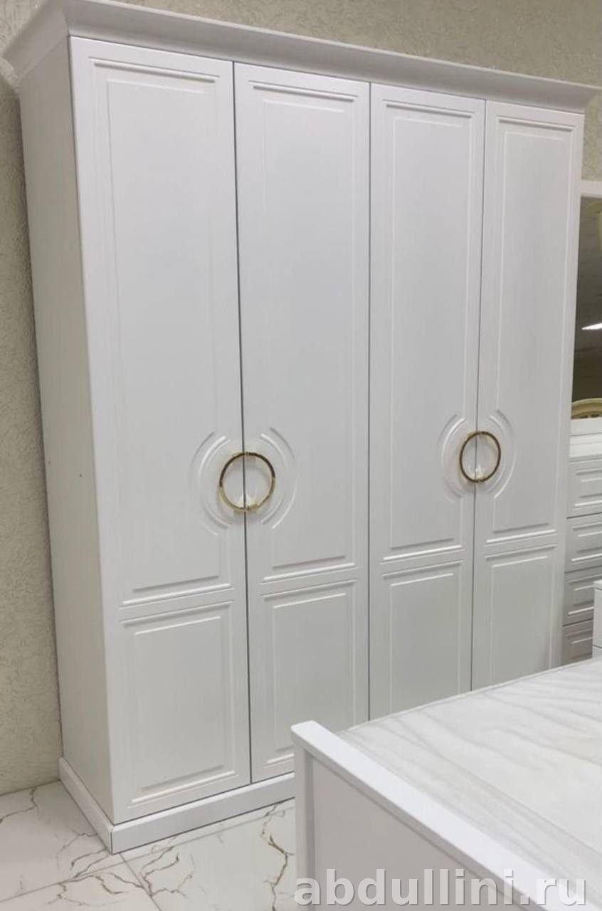 Шкаф состоит из четырех секций с распашными дверцами. Внутри предусмотрены полки и штанги для одежды, что даёт организовать хранение вещей максимально удобно. Петли с доводчиками обеспечивают плавное и бесшумное закрывание.