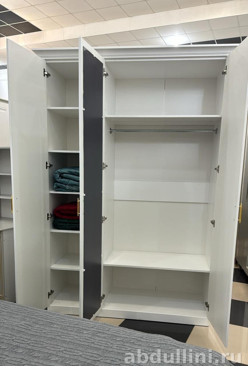 Трехстворчатый шкаф в стиле неоклассика, выполненный из МДФ или ЛДСП с матовым покрытием. Основной цвет — белый, также доступен серый. Шкаф сочетает классические формы с современными материалами, что делает его универсальным для любого интерьера.