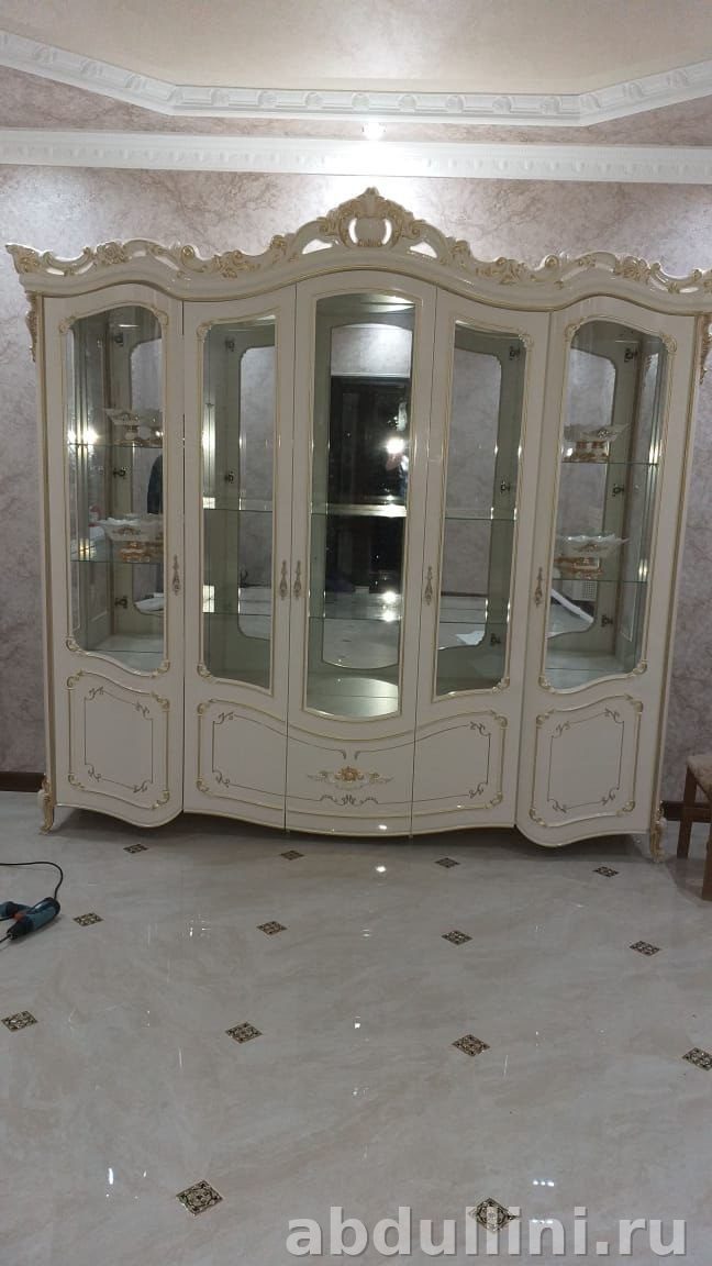Этот шкаф-витрина — отдельно стоящая модель белорусского производства. Подойдет для тех, кто ценит классический стиль с деталями: резные узоры, золотую патину и глянцевую поверхность.
