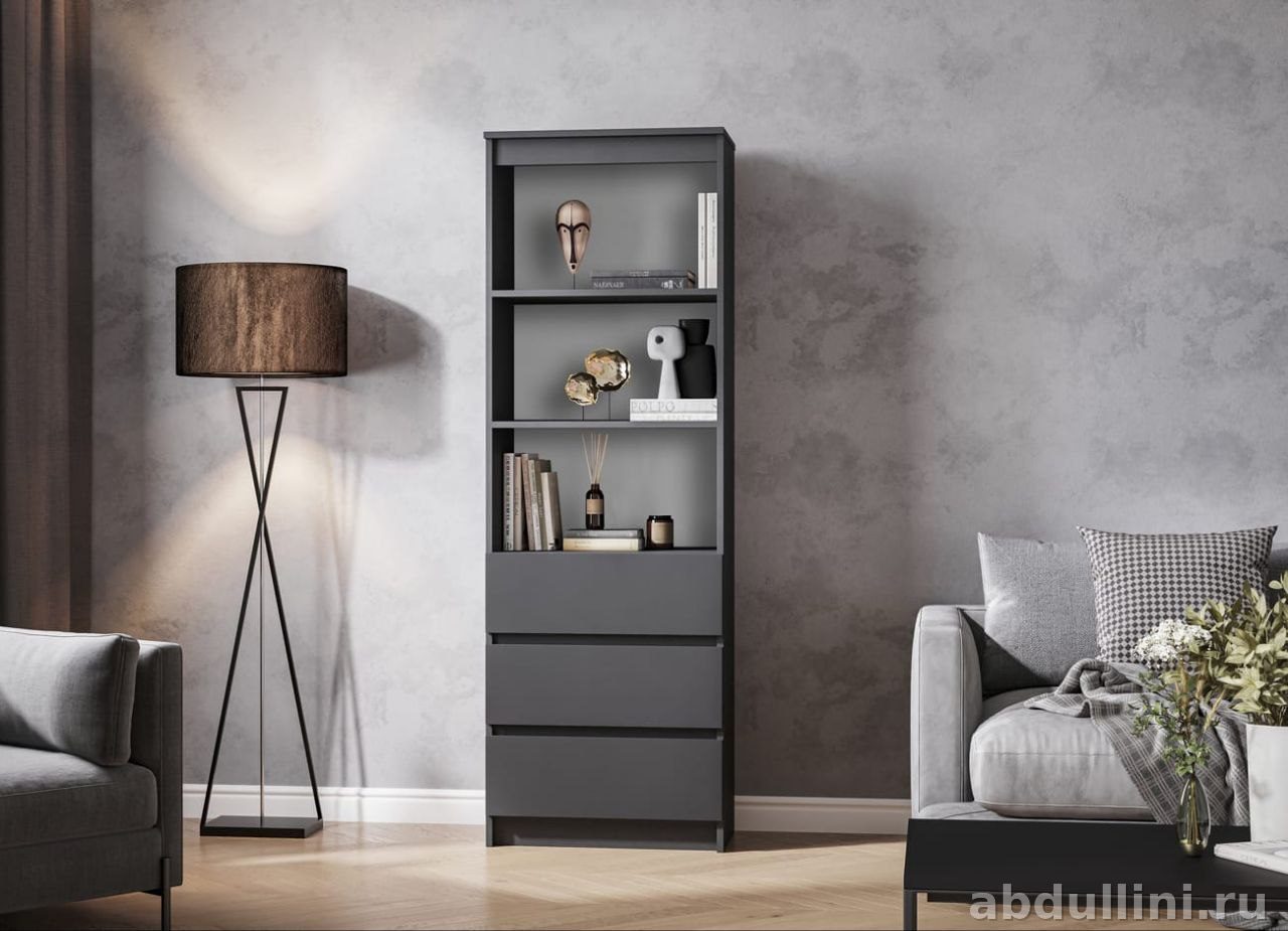 удобный и стильный стеллаж для дома или офиса. Корпус и фасады из ЛДСП 16 мм в насыщенном графитовом цвете. Матовая поверхность без глянца — практично и современно.
