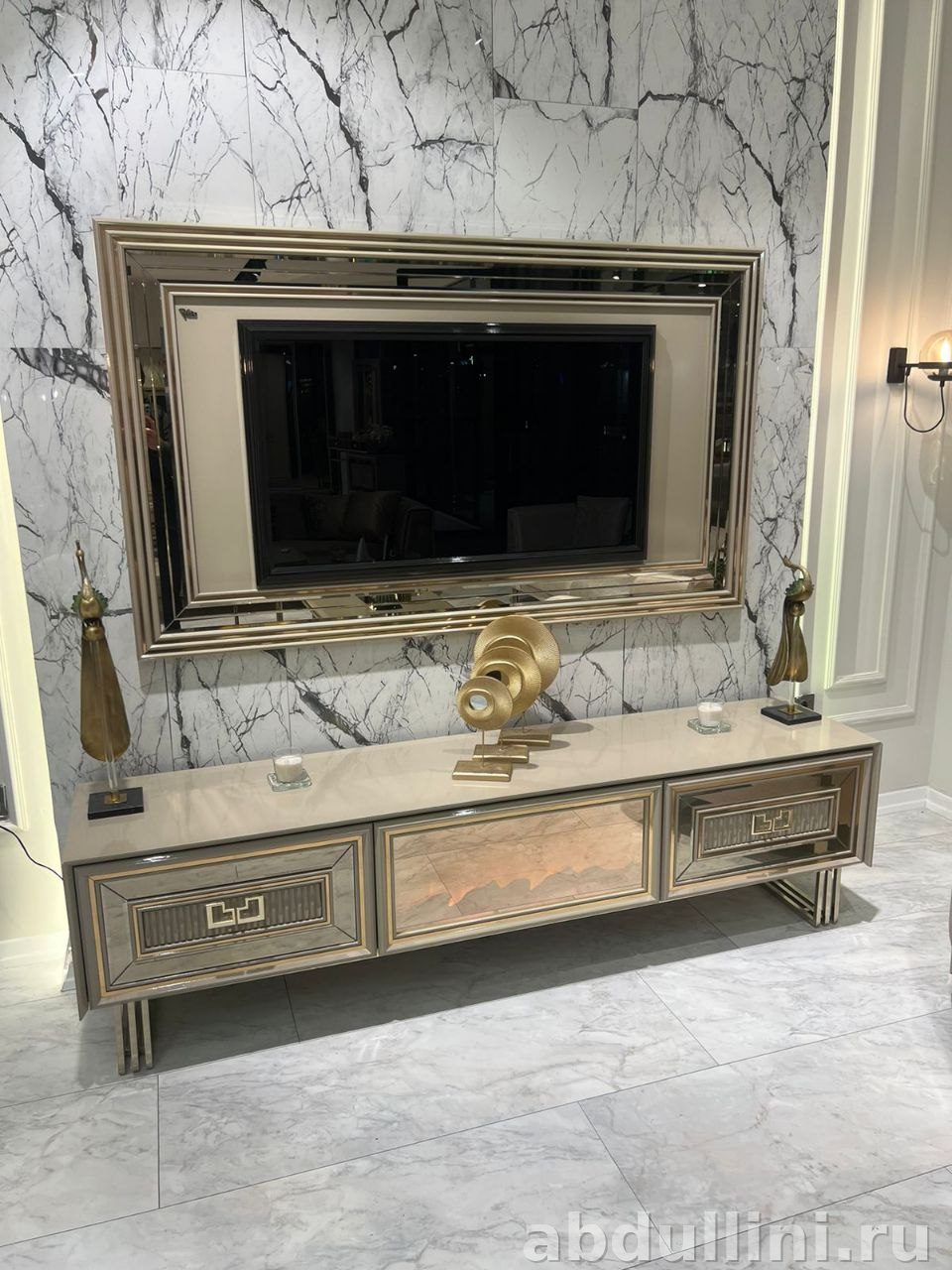 Мебельный комплект для гостиной в стиле неоклассики с элементами гламура. Включает ТВ тумбу и витрину-шкаф. Подойдет для оформления зоны ТВ и хранения вещей.