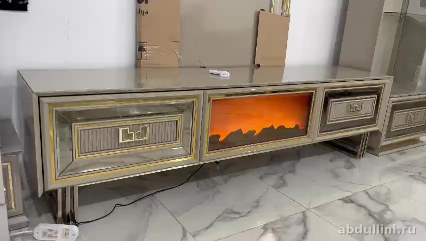 - Материал: корпус и фасады из ЛДСП или МДФ с глянцевым покрытием, стеклянные элементы, металлические ножки с золотистым покрытием.