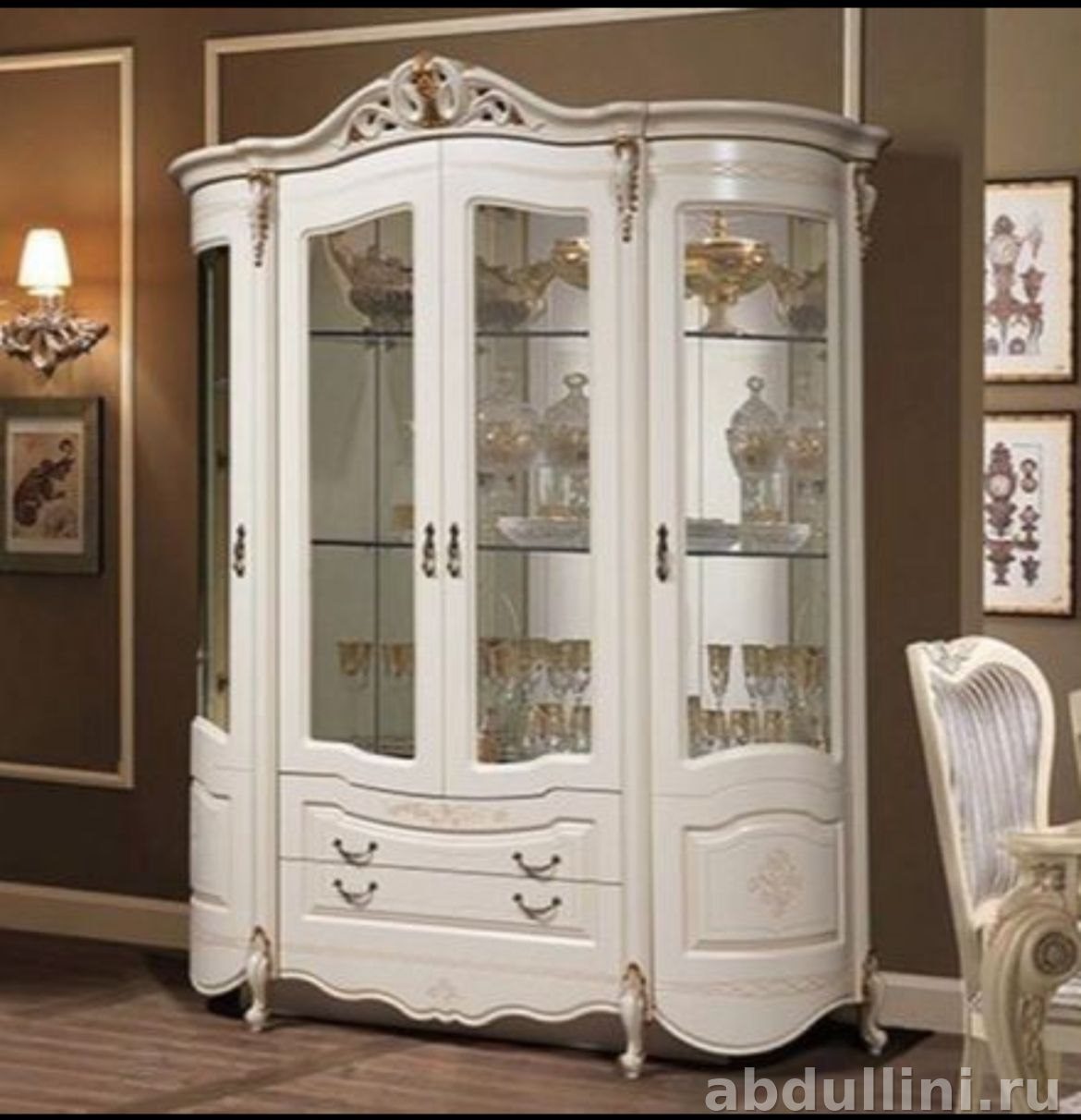 Размеры: высота 2325 мм, ширина 1914 мм. Витрина подойдёт для размещения посуды, книг или декоративных предметов. Фигурные ножки с золотистой отделкой добавляют изысканности.