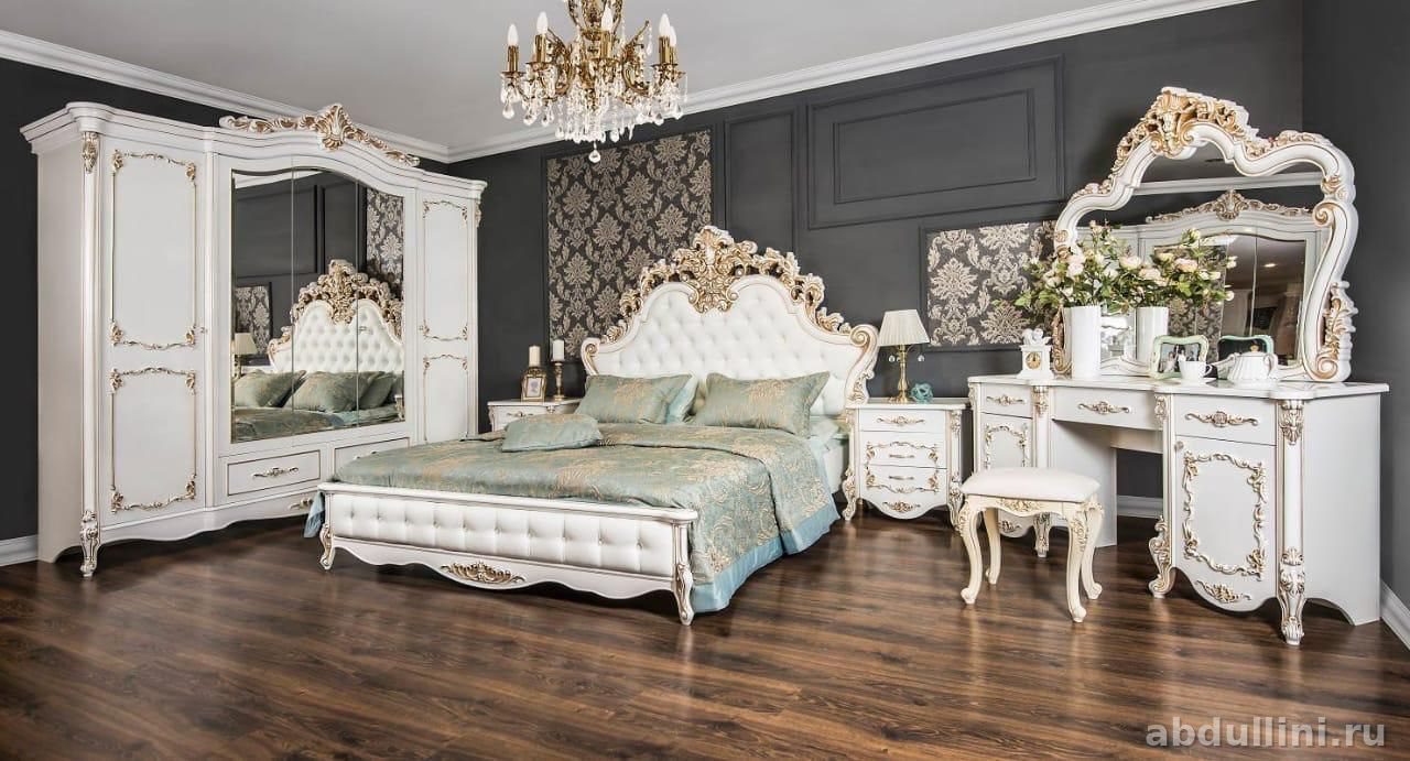 Полный набор для спальни в стиле неоклассика. В комплекте: двуспальная кровать с высоким изголовьем, две тумбочки, трехстворчатый шкаф с зеркальными дверцами, туалетный столик с зеркалом и банкетка. Мебель белого цвета с кремовым оттенком, глянцевая поверхность, золотистые декоративные элементы.