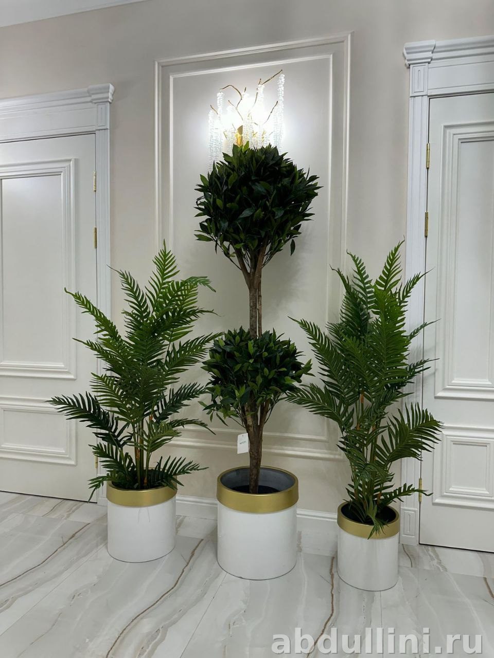 Горшки цилиндрической формы без дренажных отверстий — чисто декоративные. Растения выглядят как живые, но не требуют ухода. Разнообразие форм: шар на стволе, кустик и папоротники — создает интересный визуальный эффект.