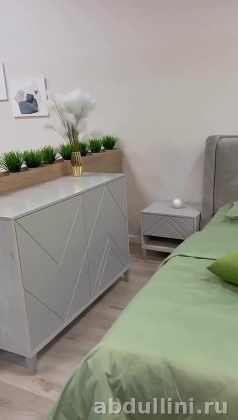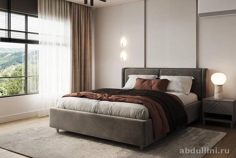 Кровать с мягким изголовьем и платформой в сером оттенке «графит» создает уютную атмосферу. Шкаф с четырьмя дверями и декоративными геометрическими линиями на фасадах добавляет стиля. Прикроватная тумбочка в тон кровати завершает комплект.