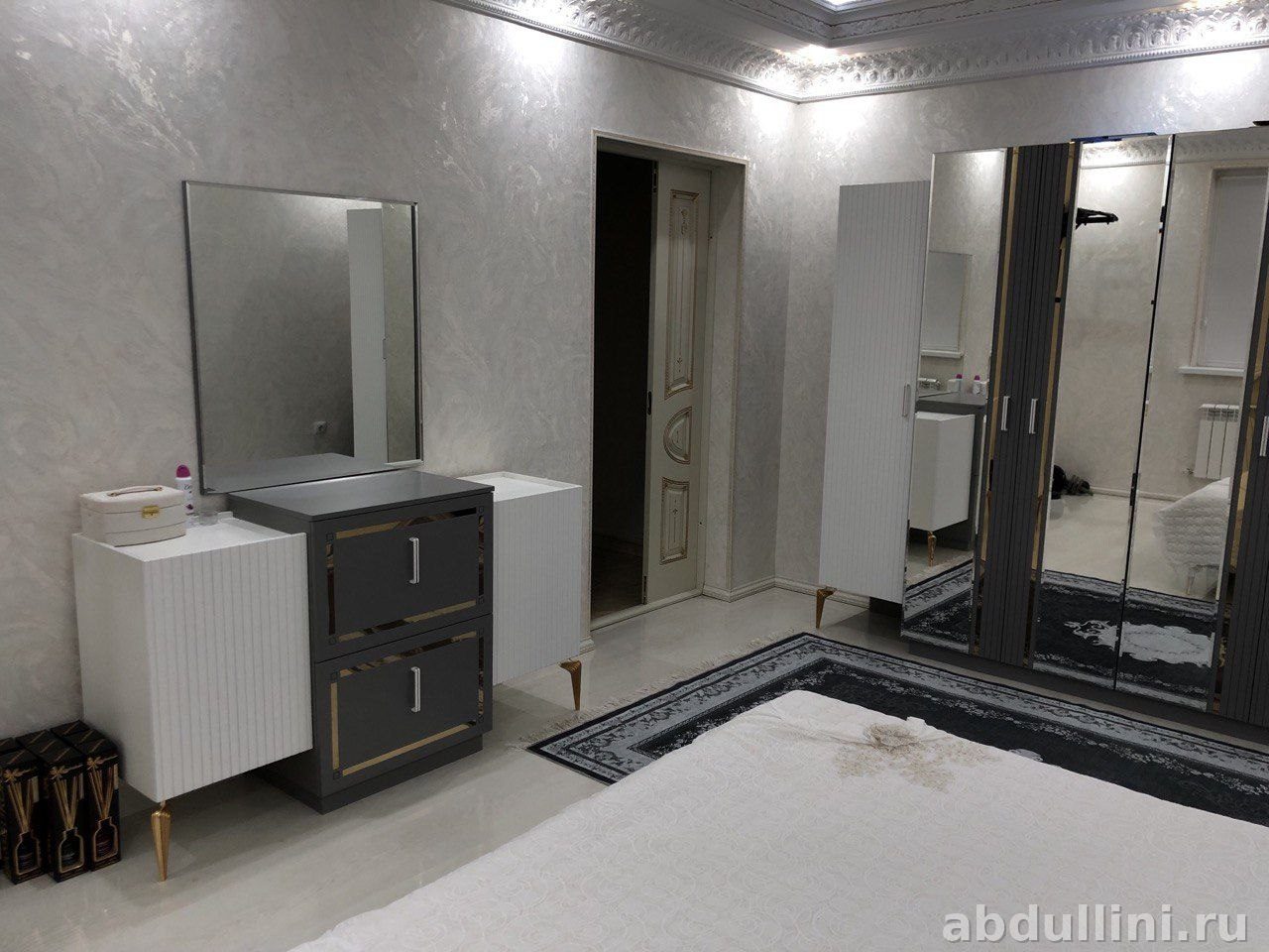 Спальный гарнитур в современном стиле с элементами неоклассики. В комплекте: кровать 180×200 см, шкаф с 6 дверцами, две прикроватные тумбочки, туалетный столик с зеркалом.