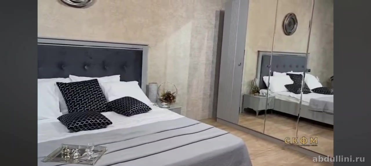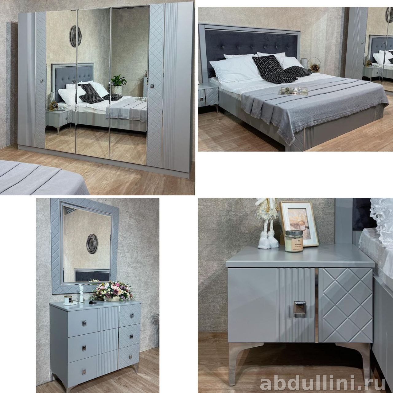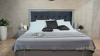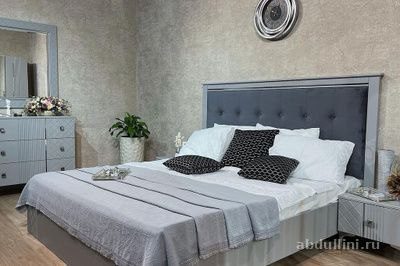 Этот стильный и удобный комплект мебели для спальни выполнен в современном стиле с элементами неоклассики. Основной цвет — светло-серый с матовой отделкой, что делает мебель универсальной и практичной. Изголовье кровати обито тканью темно-серого оттенка с декоративными пуговицами, добавляя уюта и изысканности.