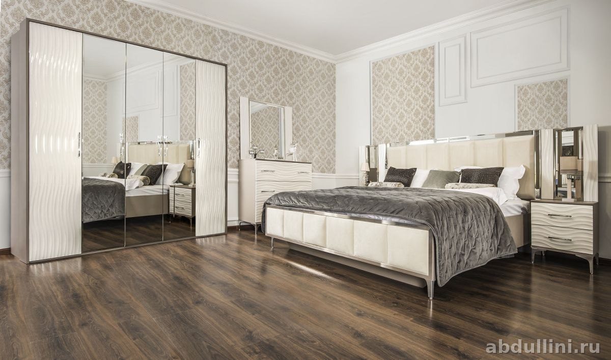 - Комплектация: кровать (180х200 или 160х200), две прикроватные тумбочки, комод с зеркалом или туалетный стол с пуфиком, шкаф-купе.