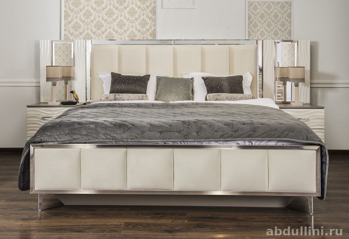 - Конструкция: изголовье кровати с мягкой обивкой и зеркальными вставками, фигурные ручки на ящиках, декоративная фрезеровка на фасадах.