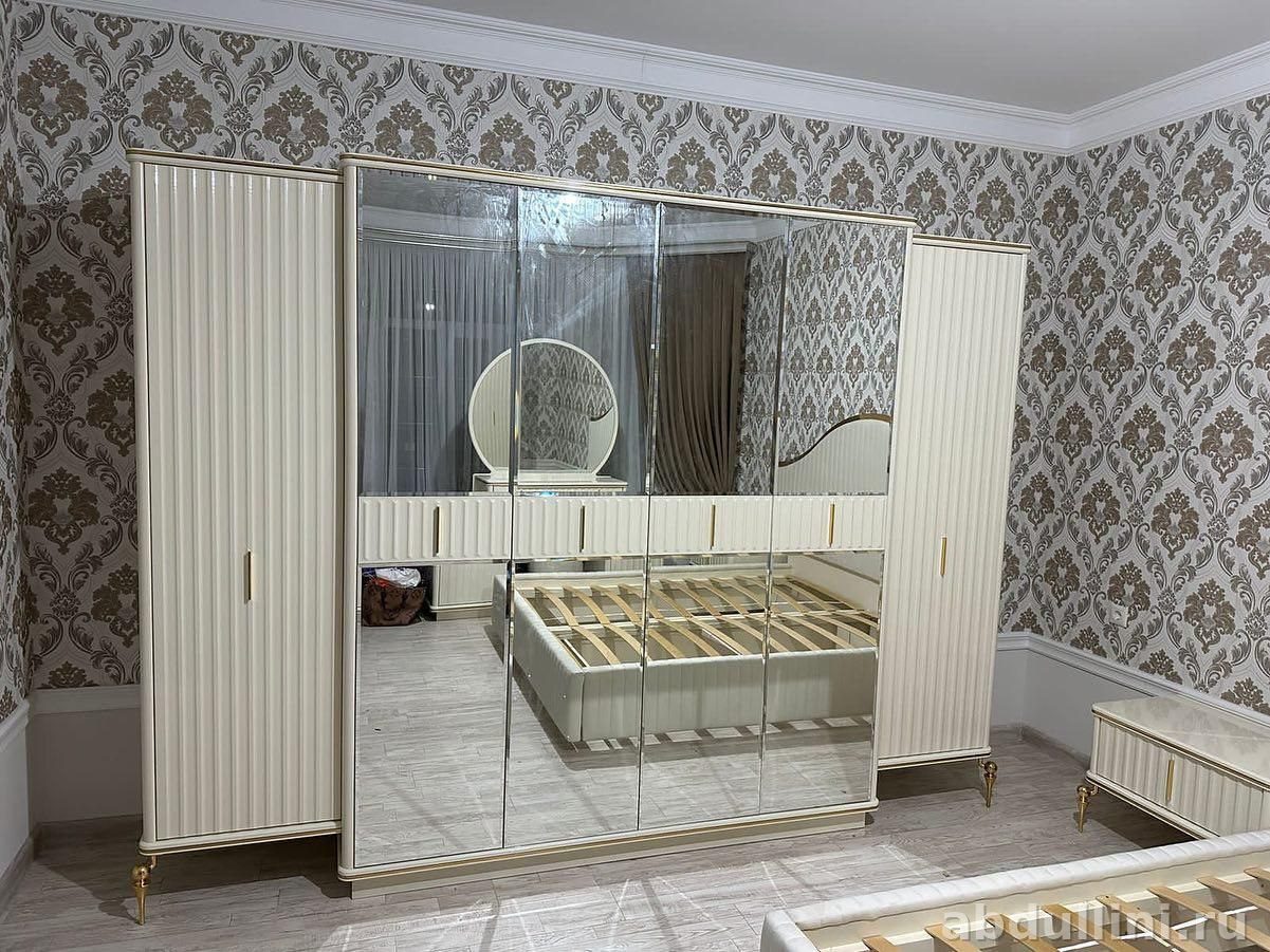 Комплект 2450 — это готовое решение для вашей спальни. В него входят кровать с высоким изголовьем, две прикроватные тумбочки, туалетный столик с зеркалом, пуф и шкаф-купе. Все элементы выполнены в едином стиле и цветовой гамме.