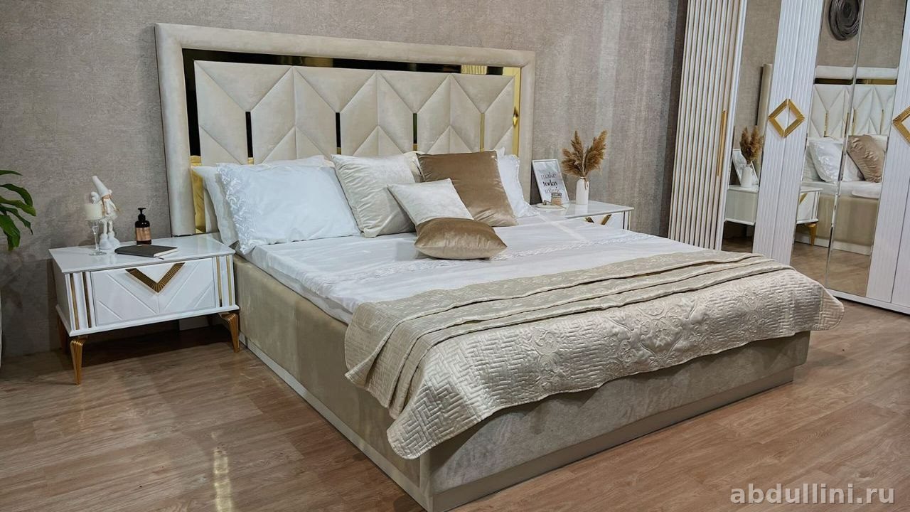 Комплект для спальни в современном дизайне. Включает кровать с подъемным механизмом, две прикроватные тумбочки и шкаф. Цвет — белый с золотистыми акцентами.