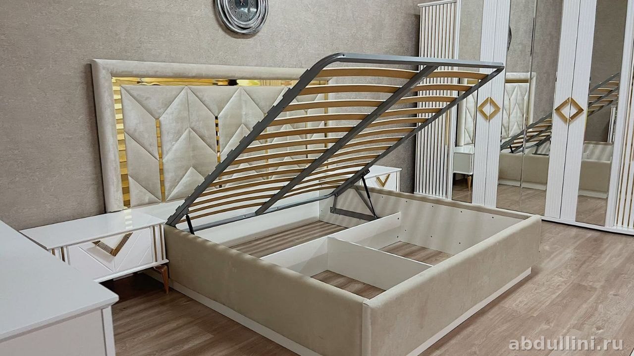 - Кровать: Двуспальная, с мягким изголовьем в геометрическом узоре. Подъемный механизм открывает доступ к просторному ящику для хранения. Основание — металлический каркас с деревянными ламелями.