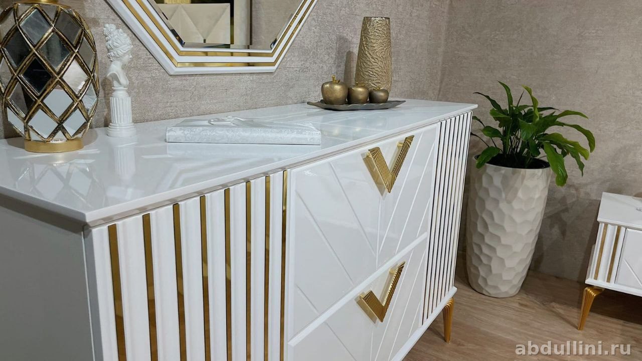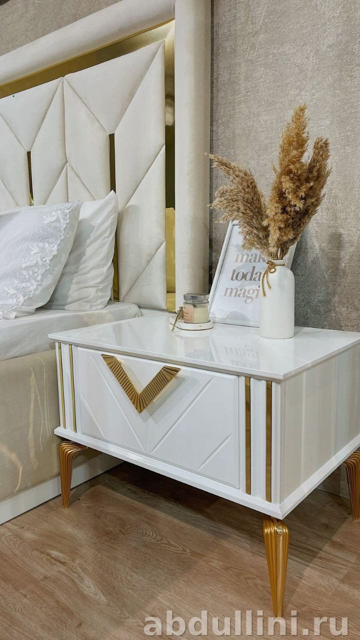 - Тумбочки (2 шт.): Белые, с глянцевым покрытием. Выдвижной ящик с золотистой ручкой. Ножки металлические, фигурные.