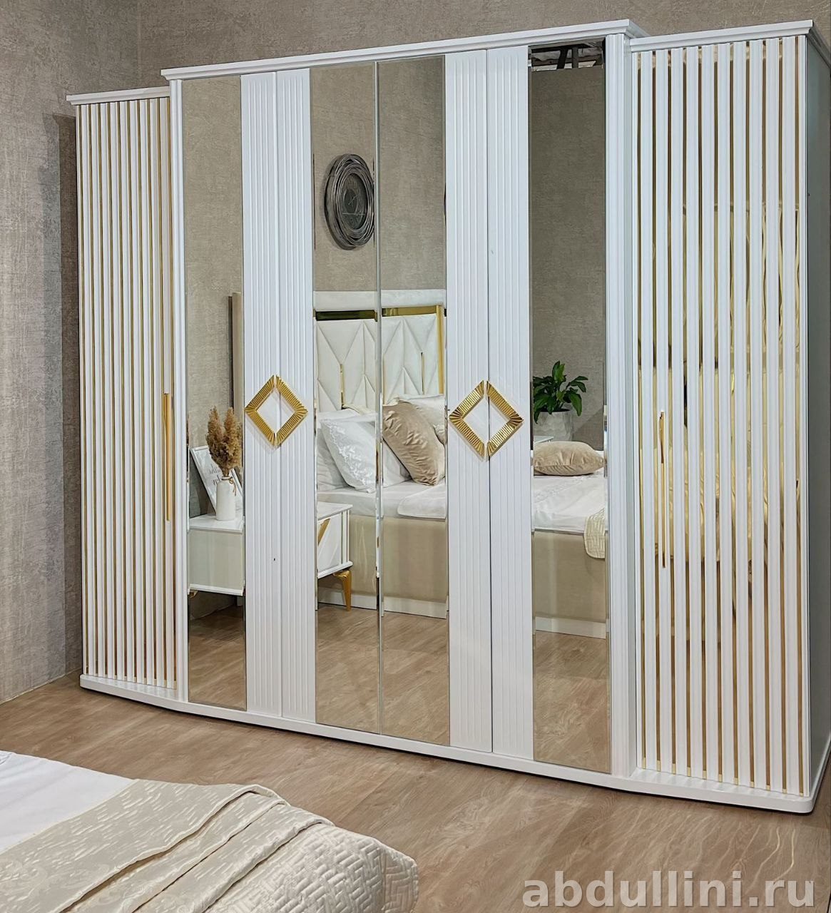 - Шкаф: Белый корпус с зеркальными вставками. Фасады из МДФ с глянцевым покрытием.