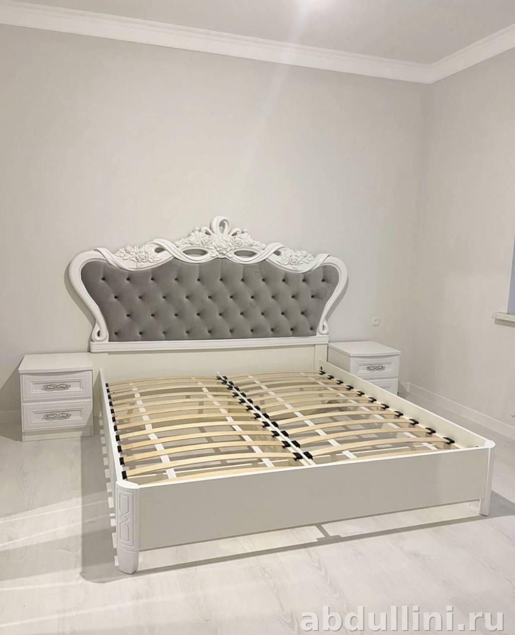 - Кровать: Размеры — 2275х2077х1575 мм. Изголовье обито серой тканью с ромбовидной стяжкой, декоративная лепнина белого цвета. Основание — деревянные ламели.