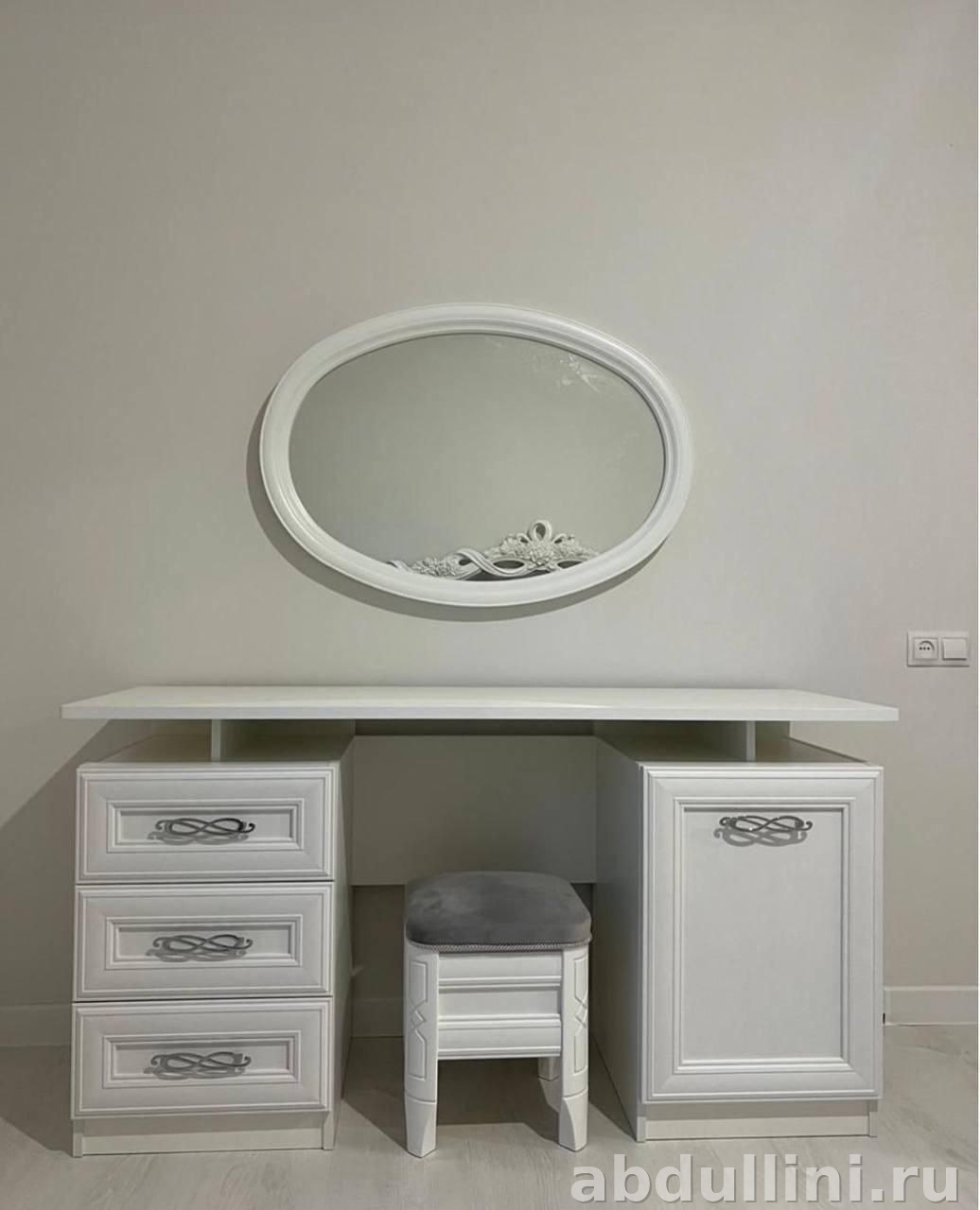 - Туалетный стол: Размеры — 1500х508х792 мм. В комплекте зеркало (997х697 мм) и пуф (350х350х410 мм).
