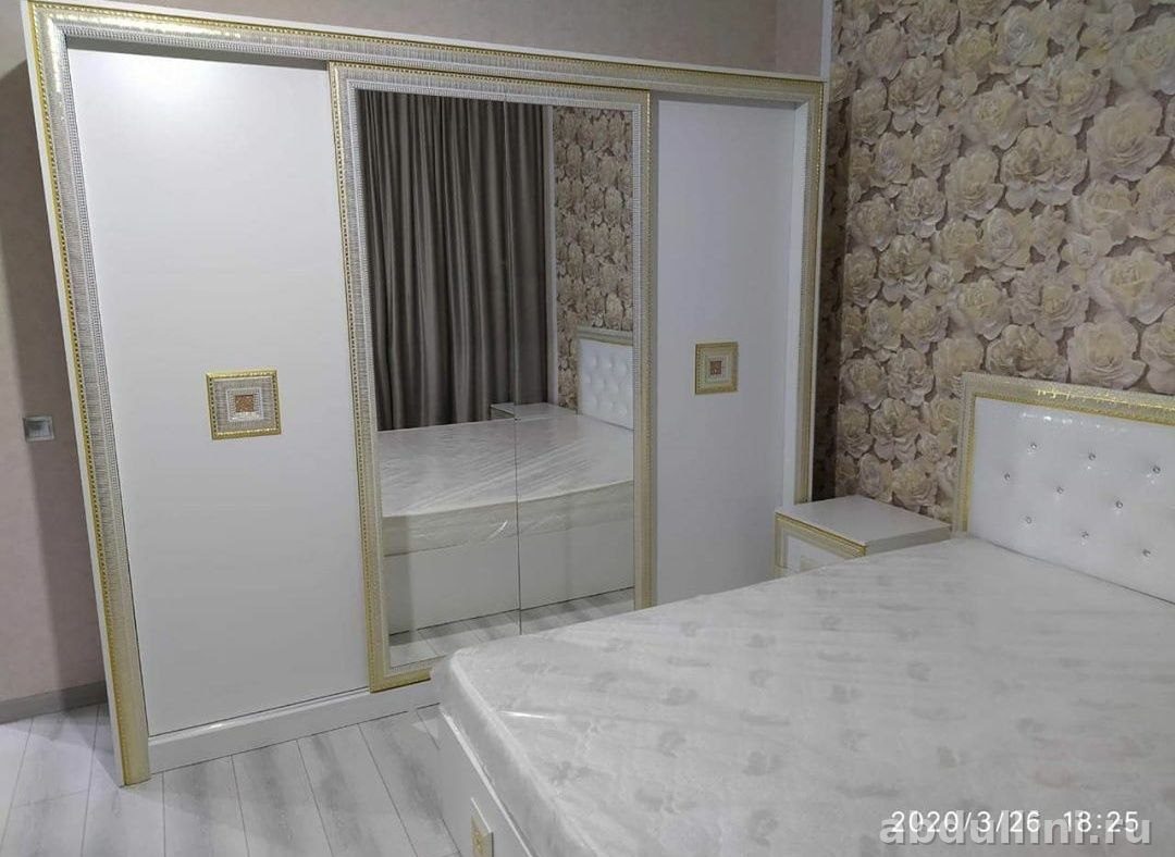- Шкаф-купе: двухдверный, с одной зеркальной и одной белой дверью. Внутри — полки и штанга для одежды.