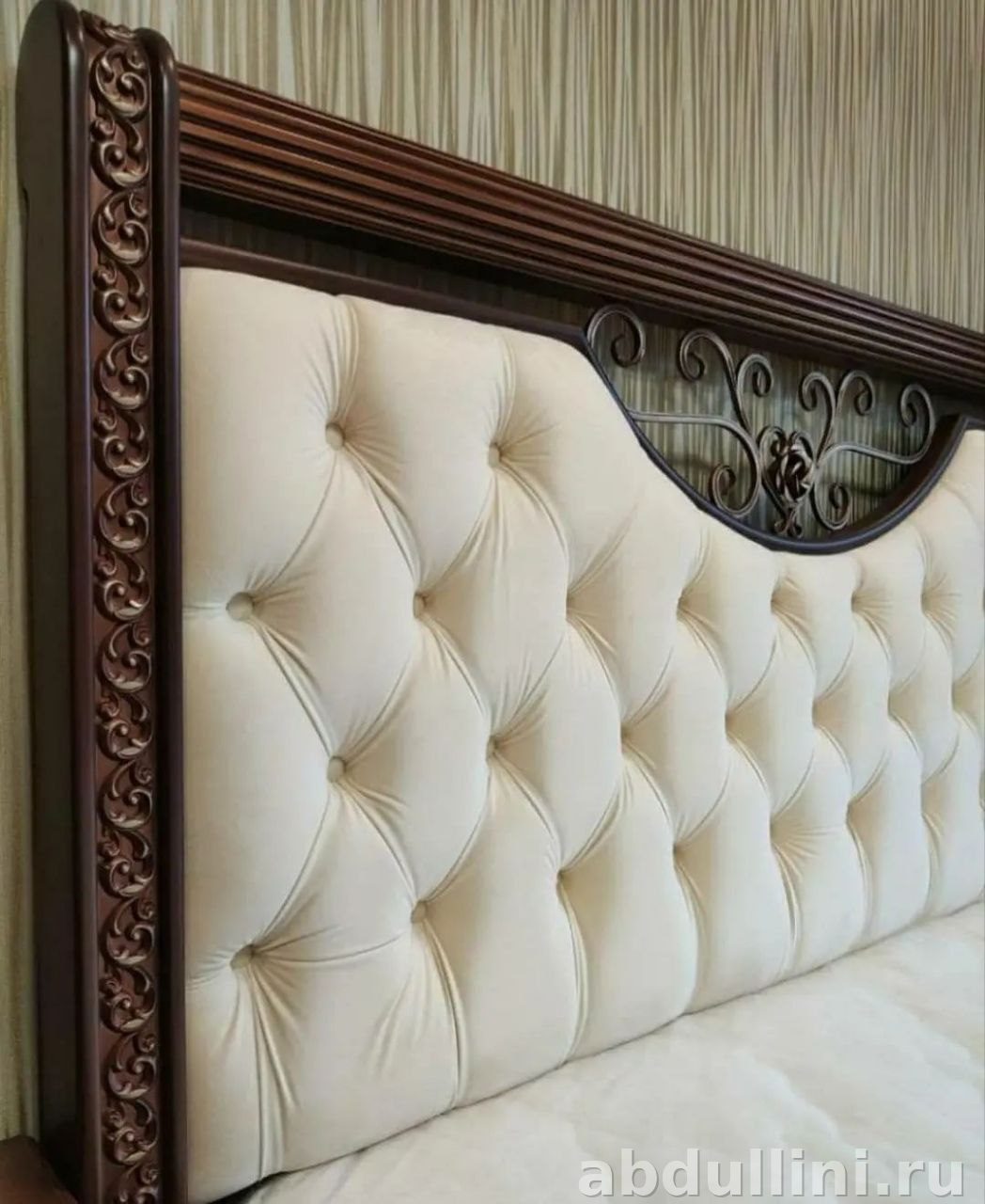 - Кровать: 2100×1812×1350 мм, обивка — велюр кремового цвета, каркас — МДФ с декором под массив.