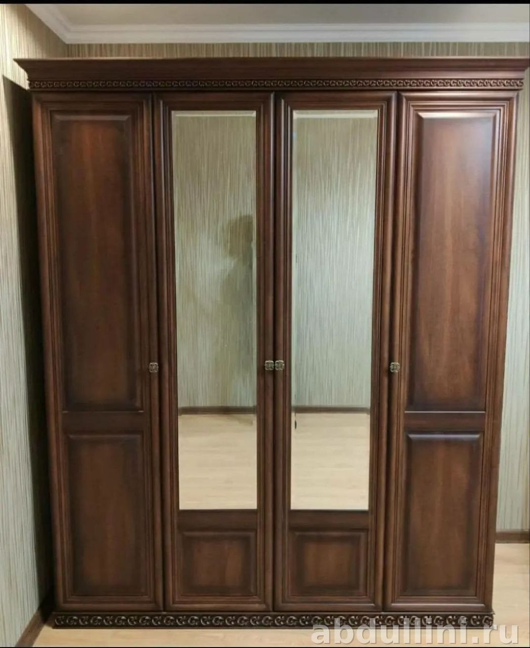 - Шкаф: 1890×665×2250 мм, 4 двери (2 с зеркалами), полки и штанга для вешалок.