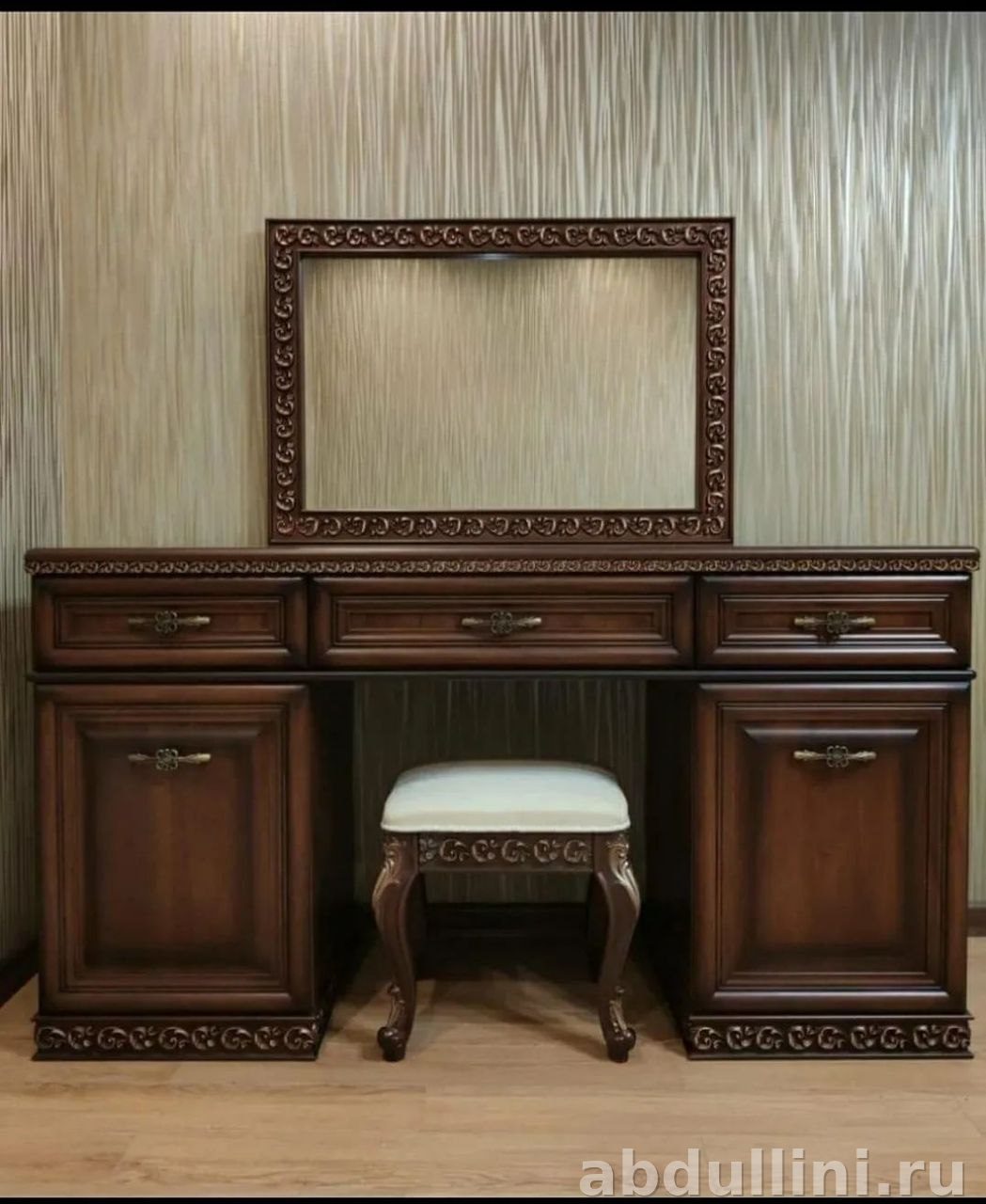 - Туалетный стол: 1548×512×840 мм, зеркало в резной раме.