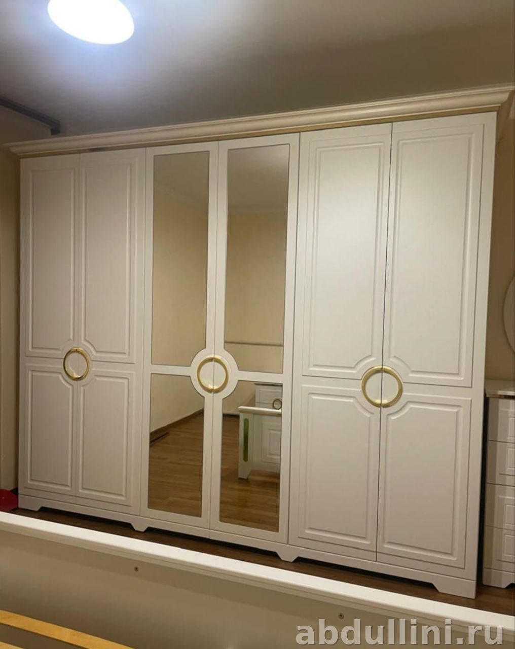 - Шкаф для одежды: Шестидверный, размеры 2200х2748х640 мм. Внутри полки и штанги для одежды. Центральные двери с зеркальными вставками.
