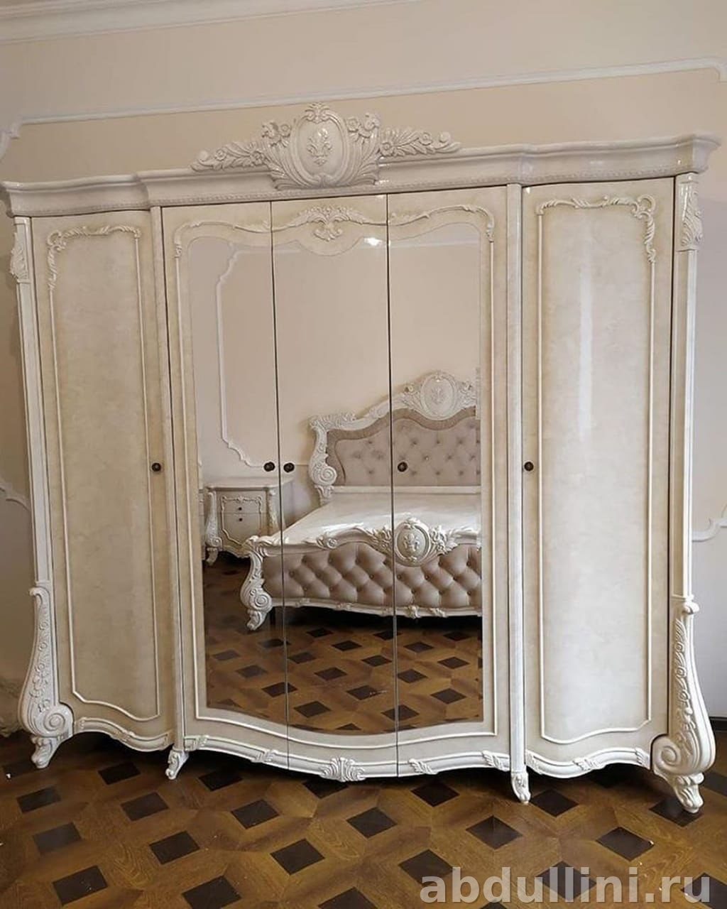 Комплект мебели 1088 — это стильное и функциональное решение для спальни. Включает кровать, две прикроватные тумбочки, шкаф-купе и туалетный столик с пуфиком. Выполнен в светлом кремовом цвете с элементами декора в стиле рококо.