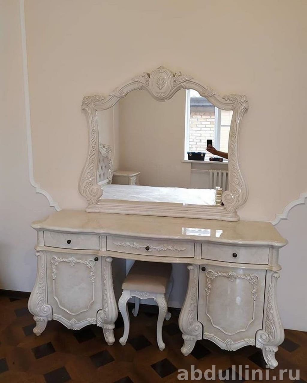 - Туалетный столик: С зеркалом, тремя выдвижными ящиками и двумя тумбами с дверцами.