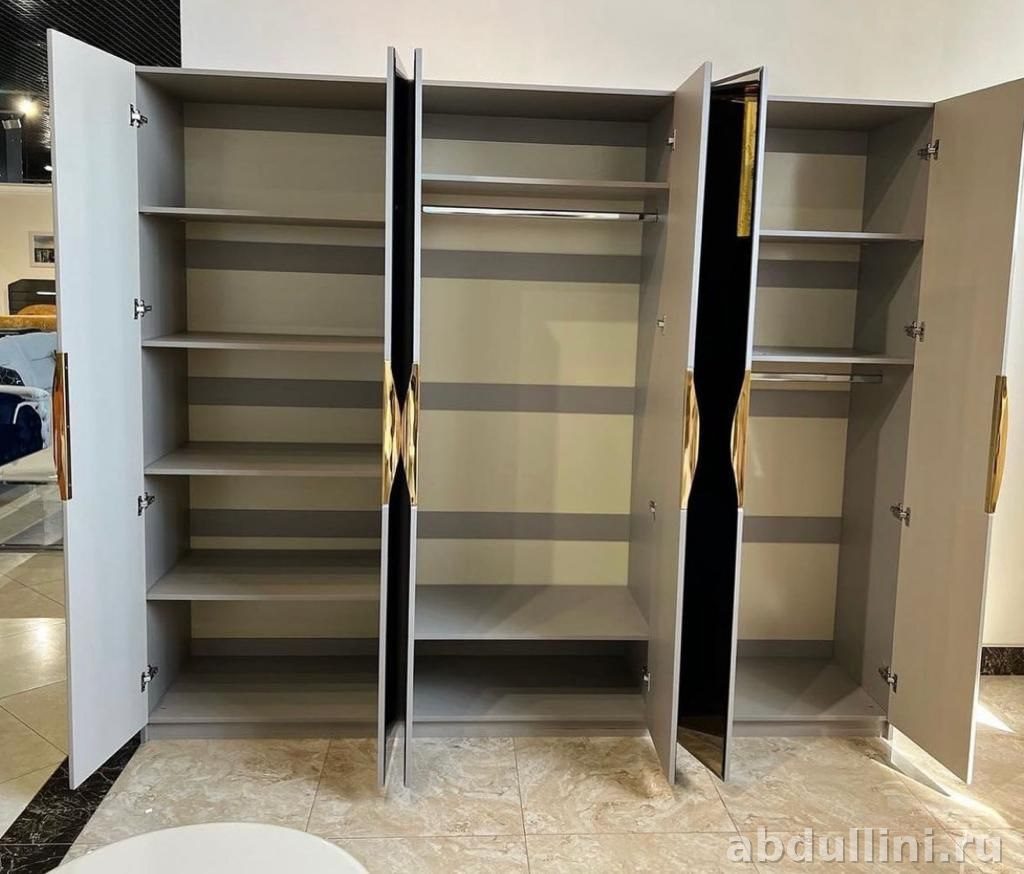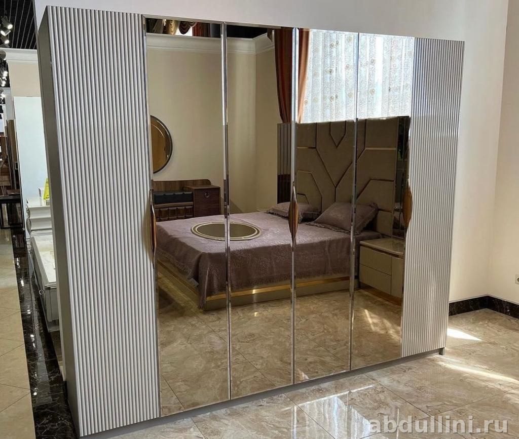 Основной цвет — бежевый с золотистыми акцентами. Комбинация глянцевых и матовых поверхностей добавляет изысканности. Золотистые элементы имеют глянцевый блеск, а зеркальные вставки на изголовье и шкафе создают эффект простора.