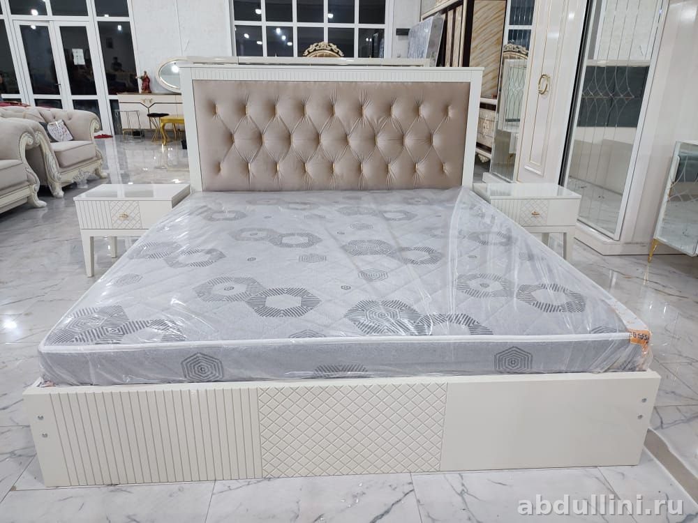 - Кровать: размеры 180/200 см, мягкое изголовье с ромбовидной стяжкой. Оснащена подъемным механизмом или ящиками для хранения (точный вариант уточняйте).