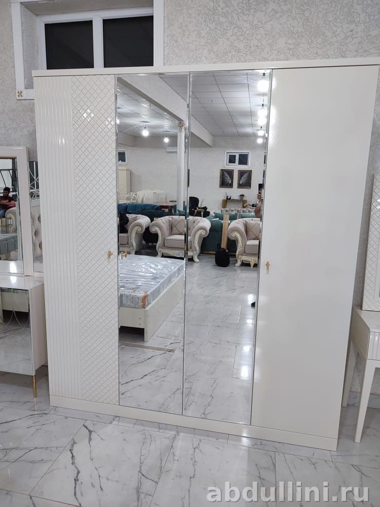 - Шкаф: 4 двери, две центральные — зеркальные. Внутри — полки и штанга для одежды.