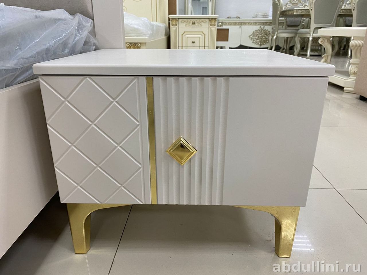 - Две прикроватные тумбочки с выдвижными ящиками и золотистыми ножками.