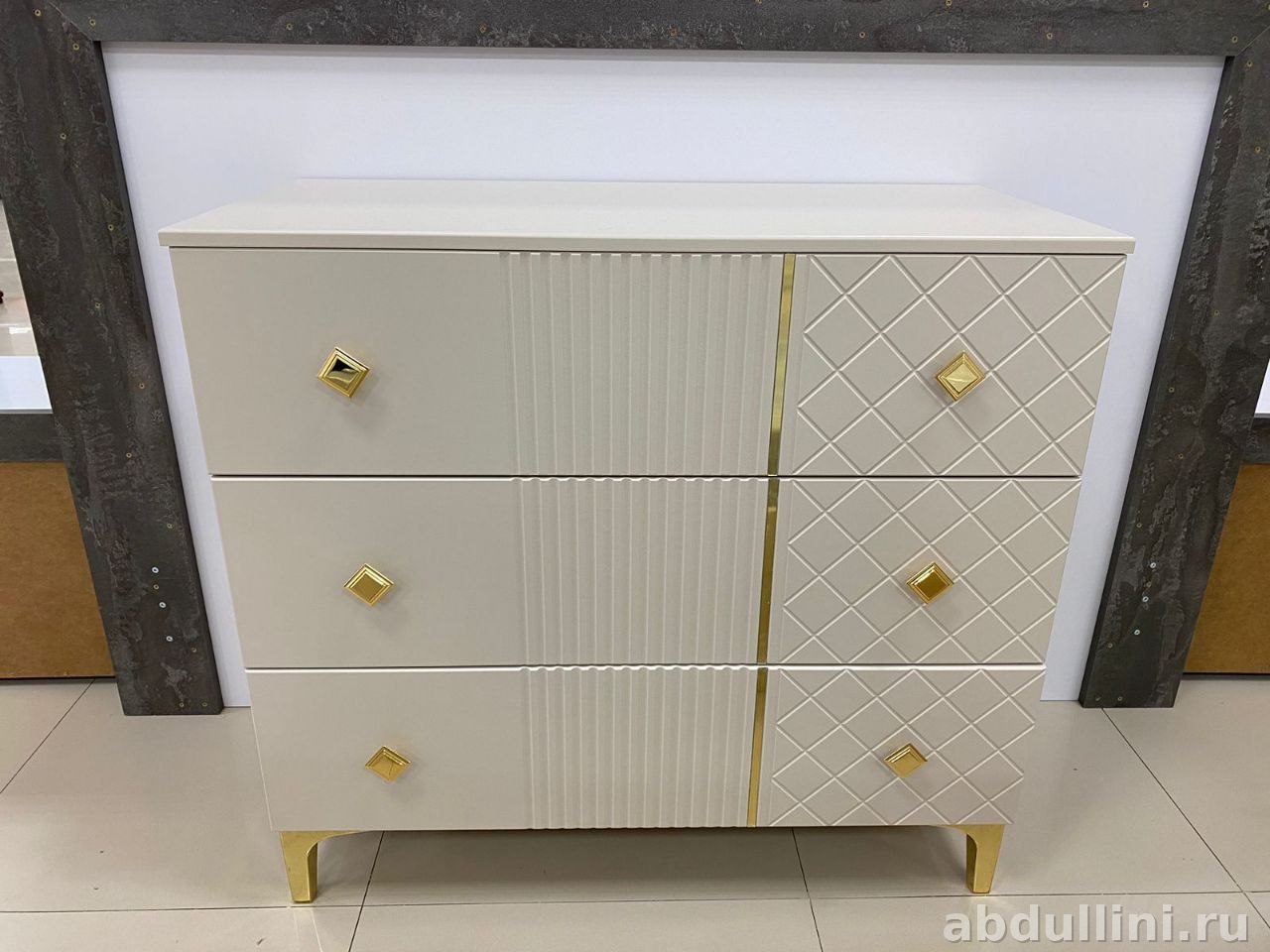 Корпус мебели выполнен из ЛДСП или МДФ — прочных и долговечных материалов. Фасады шкафа и комода дополнены глянцевыми и зеркальными вставками. Мягкое изголовье кровати обтянуто тканью или экокожей для удобства и комфорта. Фурнитура — металл с золотистым покрытием, что делает изделие устойчивым к износу.