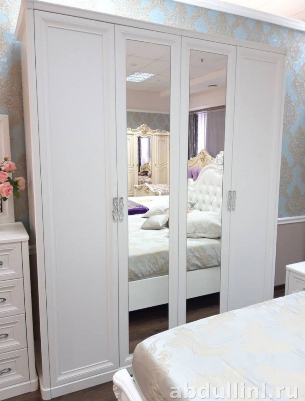 Комплект для спальни в классическом стиле. Включает кровать с изголовьем, шкаф, комод, тумбочки и зеркало. Все предметы выполнены в белом цвете с матовой отделкой. Кровать оснащена подъемным механизмом и ортопедическим основанием, в комплект входит матрас.